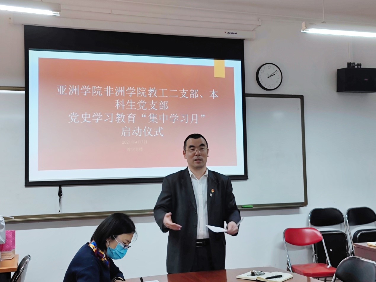 、非洲学院党总支举办党史学习教育“集中学习月”启动仪式暨第一次集中学习活动。党总支书记许晔、非洲学院院长李洪峰、教工二支部及本科生支部三十多名同志参加了主会场活动。教工一支部、研究生党支部在各自的分会场开展学习。