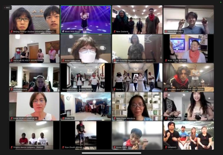 菲律宾语专业学生应菲律宾驻华使馆邀请,参与菲律宾外交部组织的线上舞蹈工作坊,与世界各国菲律宾文化爱好者共同“云学习”菲律宾传统舞蹈芒卡达霍塔舞(La Jota Moncadeña)。