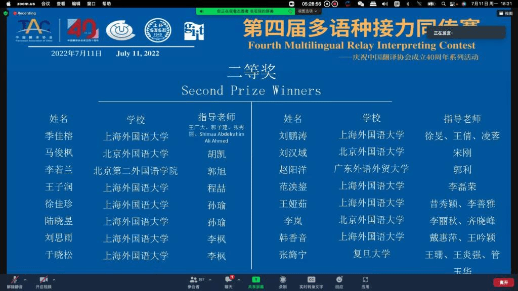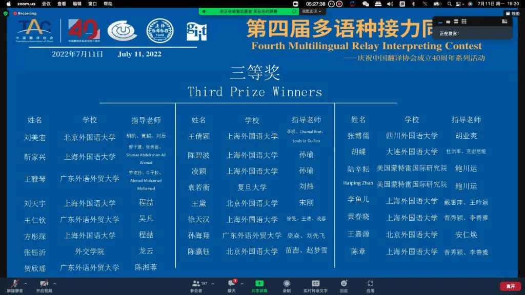 2022年7月11日,由上海外国语大学主办,中国翻译协会(口译委员会)和国际大学翻译学院联合会亚太办公室指导的第四届多语种接力同传赛决赛阶段比赛圆满落幕。我校国产视频