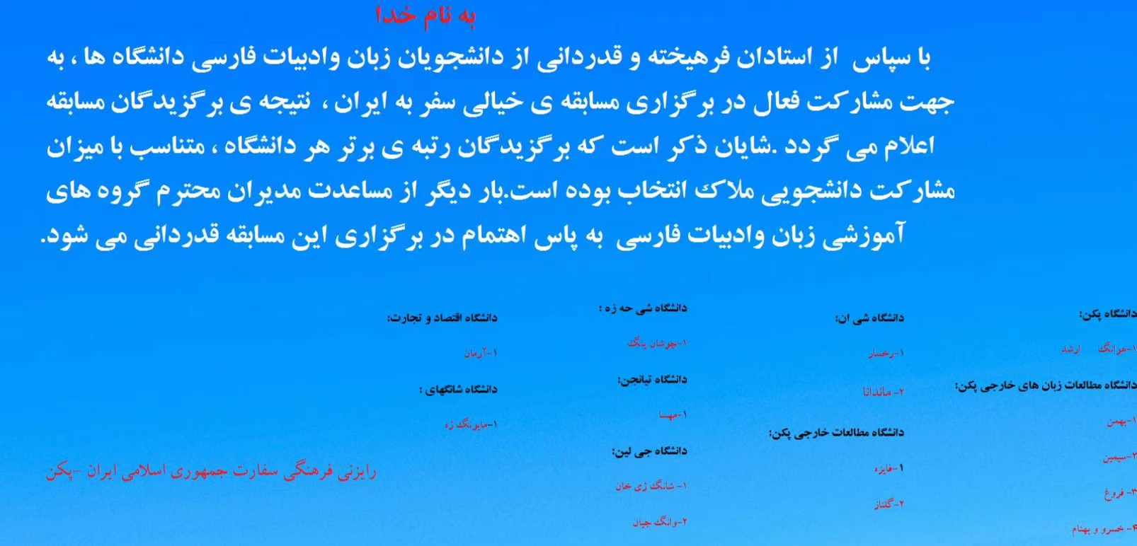 、北京第二外国语学院、上海外国语大学、对外经济贸易大学、石河子大学、西安外国语大学、吉林外国语大学、天津外国语大学等高校,选手们在比赛中提升了个人专业素养,推动了中伊友好关系的发展。