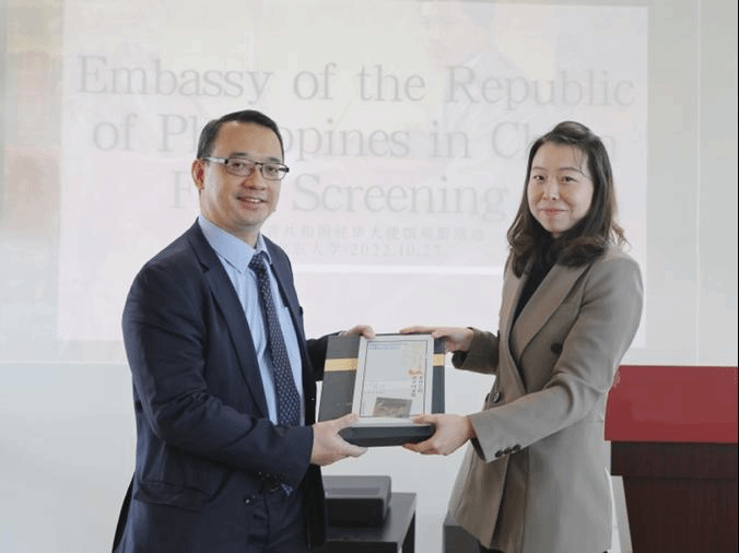 菲律宾语教研室师生于2022年10月27日受邀前往北京大学,参加菲律宾驻华使馆主办的“《黎萨的笔》电影放映及文化交流活动”。菲律宾语教研室主任霍然向菲律宾驻华使馆代办欧帝诺先生赠送了教研室主持编著的《菲律宾语讲中国文化》一书,该书系我校“多语种讲中国”之中国文化系列教材菲律宾语版。