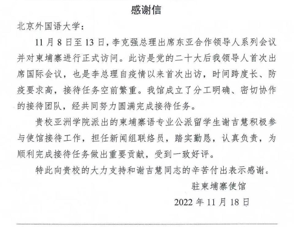 在中国驻柬埔寨大使馆的安排下,我院19级柬埔寨语专业本科生谢吉慧参与了新闻信息组的相关工作。期间,谢吉慧同学担任新闻组联络员,主要负责相关新闻信息的整理汇编和呈送汇报,并协助央视总台记者与柬埔寨新闻部及柬埔寨国家电视台相关负责人完成工作对接,工作态度认真负责,多次出色完成翻译任务,得到驻柬使馆及代表团成员的认可与肯定。中国驻柬埔寨大使馆特向我校发来感谢信,对我校的支持和谢吉慧同学的辛苦付出表示感谢。