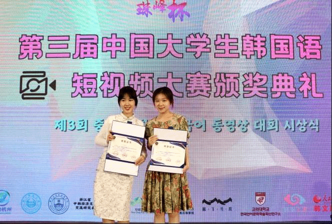 朝鲜语专业六名同学从来自全国各高校朝鲜语专业的众多作品中脱颖而出,斩获佳绩,并受邀前往杭州师范大学参加颁奖典礼。其中2020级朝鲜语专业陈婧如、林榕灿获得全国二等奖,2020级朝鲜语专业(商务方向)代白鋆、谭晶以及2021级朝鲜语专业张金梁、宋楚涵获得全国三等奖。同时,分别为三组同学提供指导的任翔老师、具滋元老师和魏国峰老师获得了优秀指导教师奖。