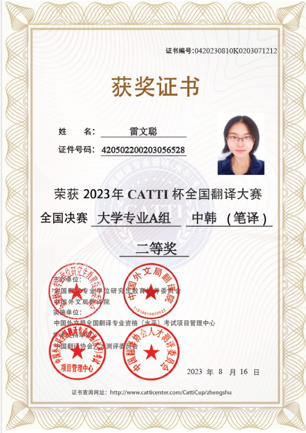 朝鲜语专业本科学生雷文聪在CATTI杯全国翻译大赛决赛中斩获佳绩。