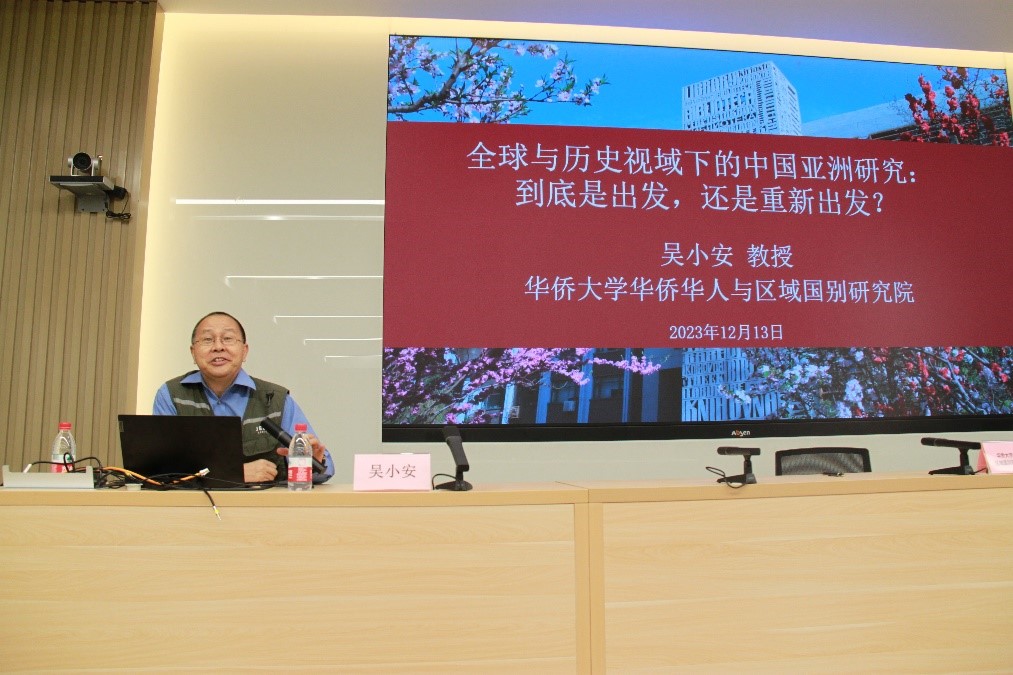讲座中,吴小安教授首先以历史纵向时间为序,介绍了全球范围内日本、澳大利亚、新加坡等将“亚洲”作为一个概念进行亚洲研究的重要学术机构及研究中心的情况,从全球范围内各个研究重镇的研究现状、研究范式、研究特征出发,勾勒全球视域下亚洲研究的概貌。然后,吴小安教授将视野转回中国,从课题、项目、人才培养等方面回顾中国的亚洲研究,并提出了我们是否真的有亚洲研究这一问题,并就怎样处理亚洲研究与区域研究、中国的亚洲研究如何开展等问题对在场教师阐述了自己的观点和看法。