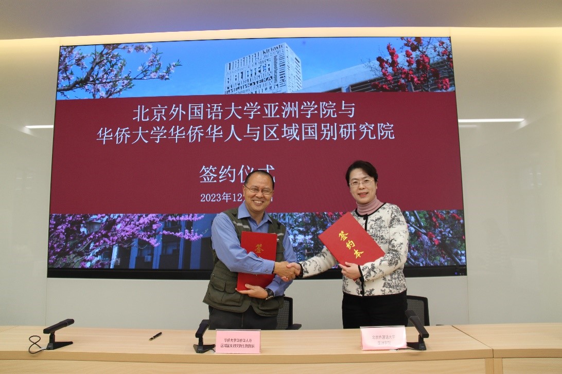 院长苏莹莹和华侨大学华侨华人与区域国别研究院院长吴小安分别代表双方签署协议。仪式由国产视频