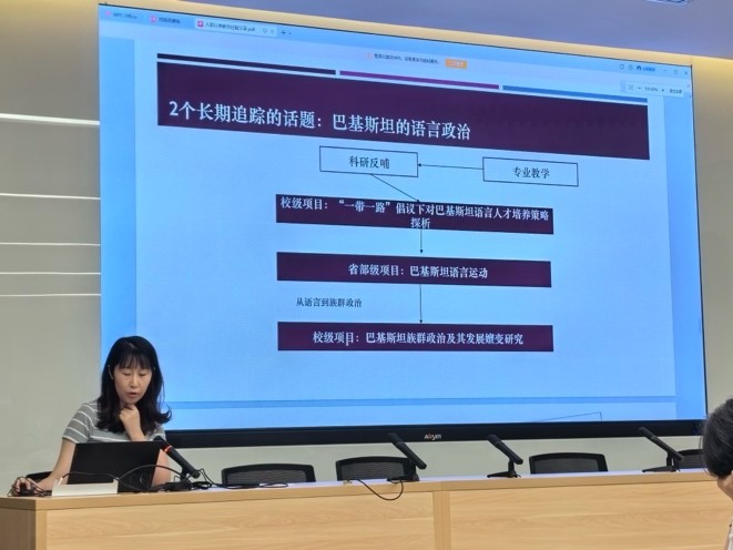两位教师乌尔都语袁雨航老师和孟加拉语曾琼教授分别进行了题为“入职以来教学经验分享”“社科基金立项简况”的发言。两位老师结合自身丰富的教学、科研经历从人才培养、课堂教学、课题申请等不同角度,分享了学术科研与专业教学的实践与经验。