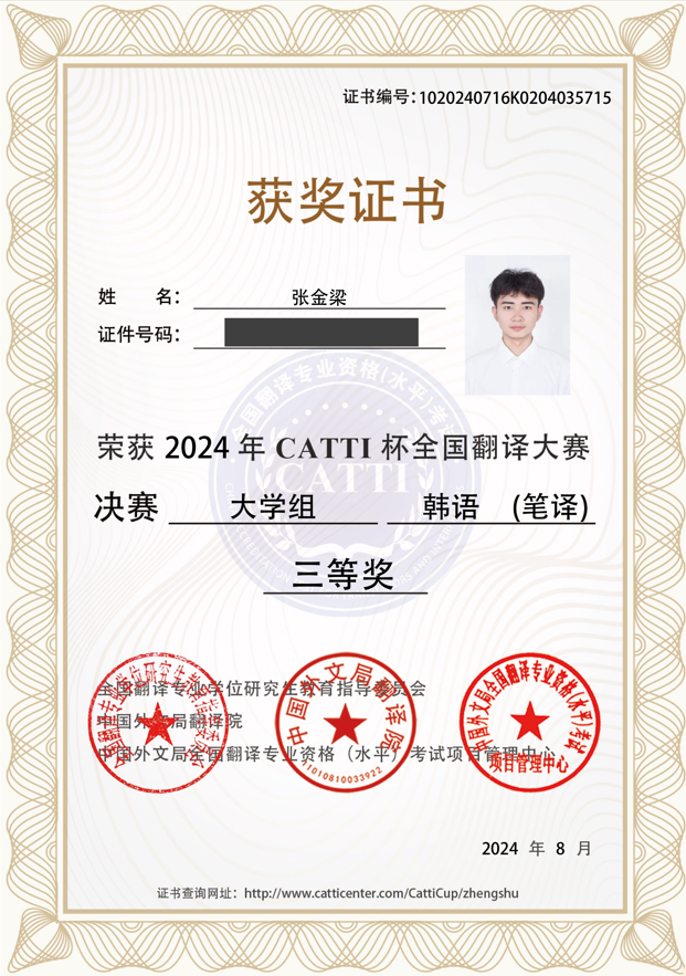 朝鲜语专业本科学生张金梁在CATTI杯全国翻译大赛决赛中斩获三等奖的佳绩。