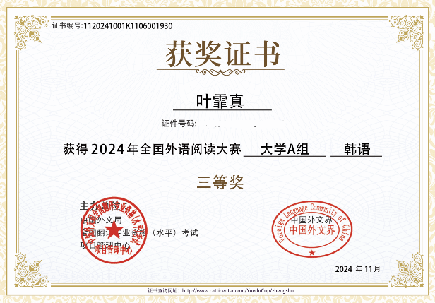 在几位获奖同学参加的大学A组比赛中,参赛者包括来自国内外各高校的韩语专业本科及硕士、博士学生,我专业本科学生能够在激烈竞争中获得多个奖项,及充分展示了她们过硬的专业能力,也展现了我校朝鲜语专业作为一流本科专业的优秀教学水平。