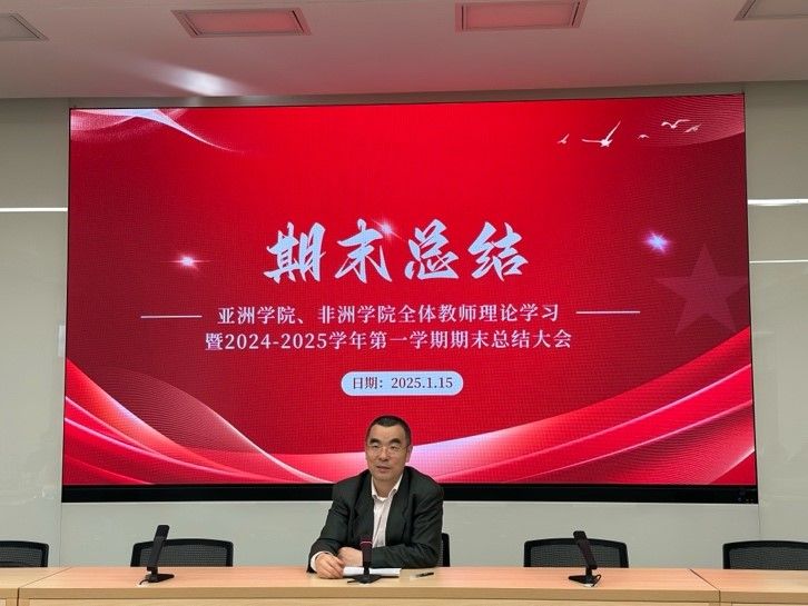 在主楼晨读厅召开全体教师理论学习暨2024-2025学年第一学期期末工作总结大会,学院党政领导和全体教职工参会。会议分为五个环节,包括亚非两院全体教师理论学习、亚非党总支工作总结、2024届就业工作总结、陆蕴联老师荣休仪式以及国产视频