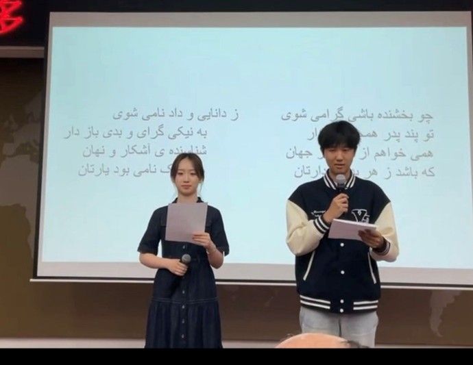 波斯语专业2024级本科生马麒竣、张靖苒作为代表朗诵了菲尔多西诗歌中关于智慧的选段,两位同学熟练的朗诵得到了全场的肯定与热烈的掌声,出色地展示了我校高水平、高质量波斯语教学的成果。