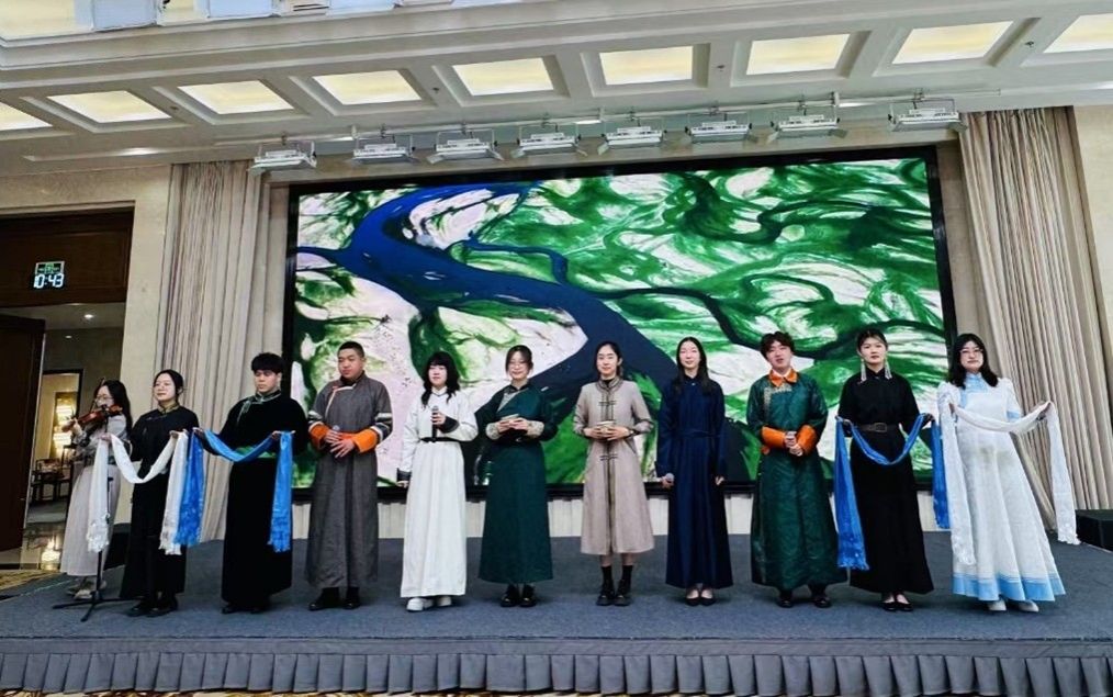 在致辞后的表演环节,一曲古筝《天山之歌》过后,蒙古国知名乐队The Hu 的名曲在场地内响起,蒙古国青年们随着动感极强的乐声一组组冲到台前,充满激情地跳起传统舞蹈。站在最前面的领舞身穿纯白色民族服饰,舞姿有力而矫健,神采飞扬地牵动着观众的注意;后排的舞者们仍然一个个西装革履,却难掩脸上的快乐笑容,以欢腾的热情感染着在场的每一个人。随后,我校2023级蒙古语本科班同学们以精心排演的歌舞《心中的爱人》作为压轴节目登台亮相。《心中的爱人》是蒙古国电影《戈壁传说》的主题曲,优美动人,余音绕梁。同学们在合唱编排中还精心加入了小提琴伴奏与顶碗舞,视觉与听觉享受交相辉映,相得益彰。蒙古国嘉宾们听了纷纷面露微笑,打起舒缓的节拍,有的还开口轻轻跟唱,深深陶醉其中。表演完毕后,同学们走下舞台将预备好的哈达敬献给与会领导致意。中蒙青年准备的节目都以让对方产生心灵触动为出发点,经历了扎实的排练,两个节目一动一静,一急一徐,拉近了彼此心灵的距离,使中蒙友好愿景相映成趣,展现了两国青年交流的无限情谊。