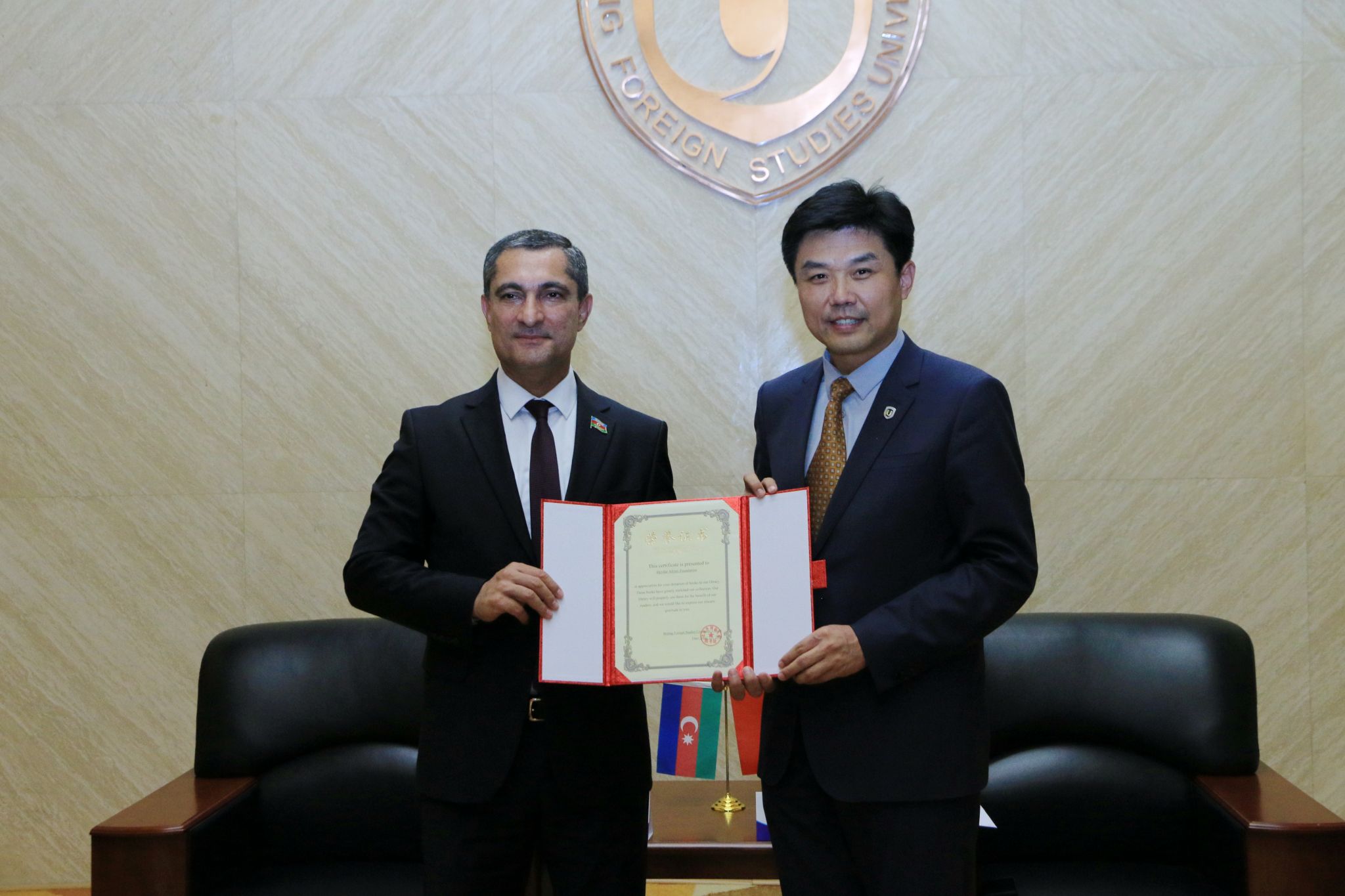 阿塞拜疆驻华大使馆参赞伊布拉希姆·伊布拉希莫夫,北外国际交流与合作处处长和静、国产视频
