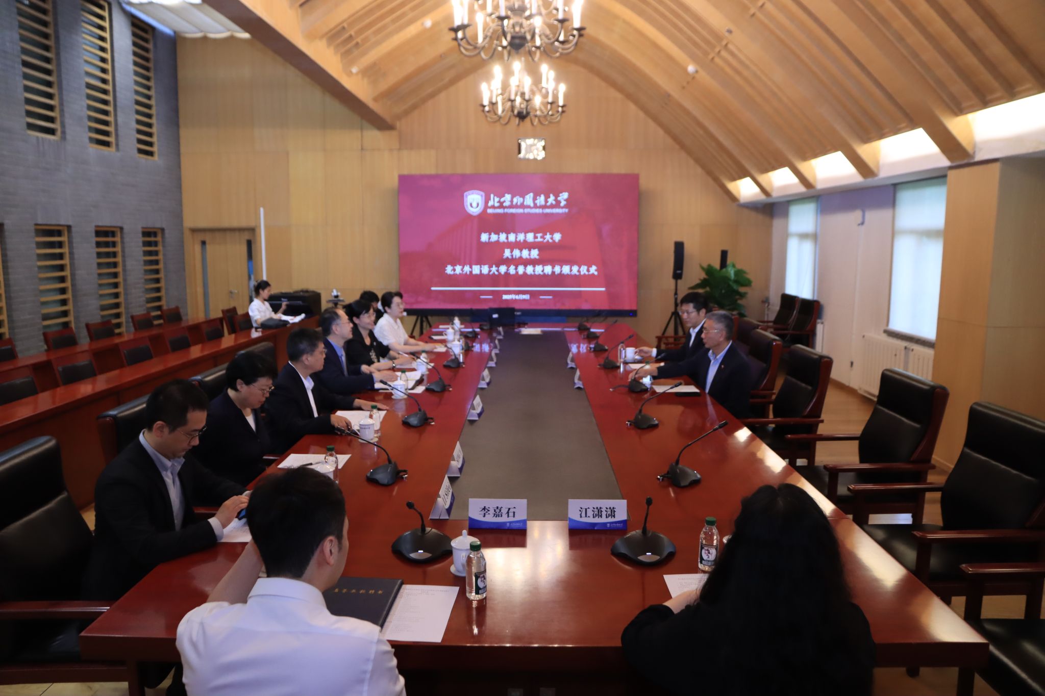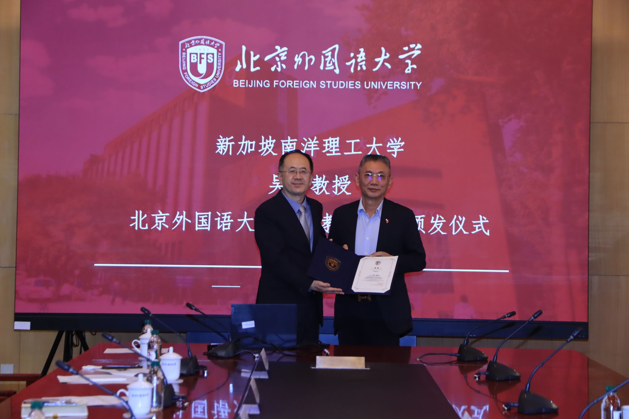 6月9日下午,新加坡南洋理工大学吴伟教授一行到访北外,我校为其举行了隆重的名誉教授聘书颁发仪式,仪式由人事处处长刘博然主持。
