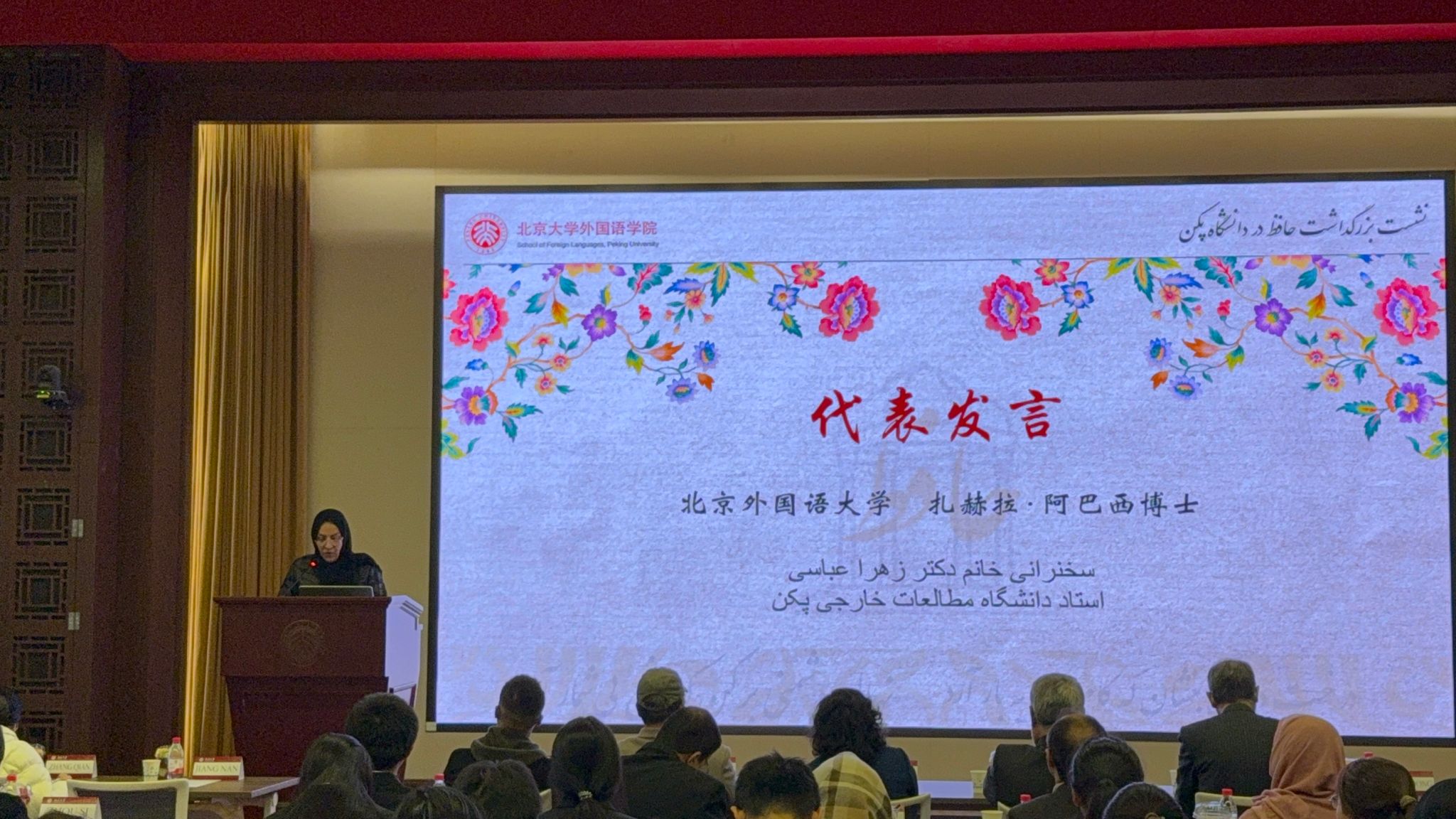 活动由北京大学波斯语专业时光教授主持,北京大学外国语学院党委书记李淑静致欢迎辞。北外波斯语教研室外籍专家阿巴斯教授作为代表发言,她从多义性与深度、人性与普世性、心理洞察力、语言音乐韵律、情感联结、社会批判和自由哲学等七个方面论述了哈菲兹的诗歌深受伊朗人民甚至世界人民喜爱的原因,哈菲兹的诗歌在现代社会的复杂与喧嚣中依然引领着人类追寻事物的意义与本真。随后,国产视频
