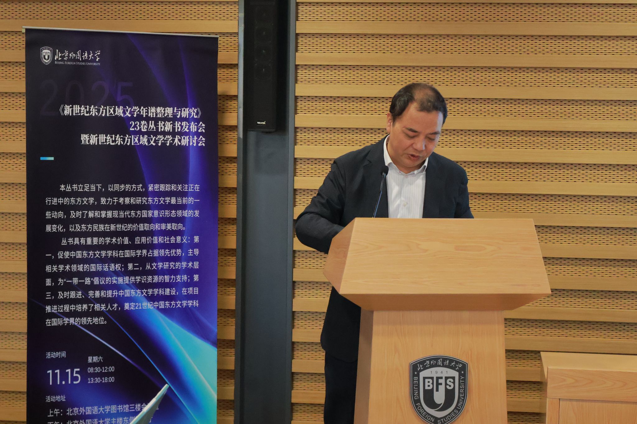 陈明在致辞中指出,东方文学作为世界文学中不可或缺的璀璨组成部分,承载着亚非地区深厚的历史底蕴、独特的文化传统与丰富的精神世界。该丛书以“年谱”这一兼具史料性、学术性与工具性的形式,对新世纪以来东方多个区域的文学发展进行了细致梳理与全面呈现。其体系之完备、内容之精深、规模之宏大,均属空前,深受学界肯定。丛书清晰勾勒出新世纪以来东方文学的演进脉络,为理解当代东方社会思想、文化动态与精神走向,提供了珍贵的一手资料与坚实的研究基础。丛书的出版,对于夯实中国东方文学研究的学科根基、构建中国视角的东方话语体系、推动中国学术在世界东方学领域发出更强音,具有不可估量的价值。这背后,凝聚着穆宏燕教授及其作者团队数年来的潜心钻研与不懈求索,是他们协同创新、锐意进取的典范之作。