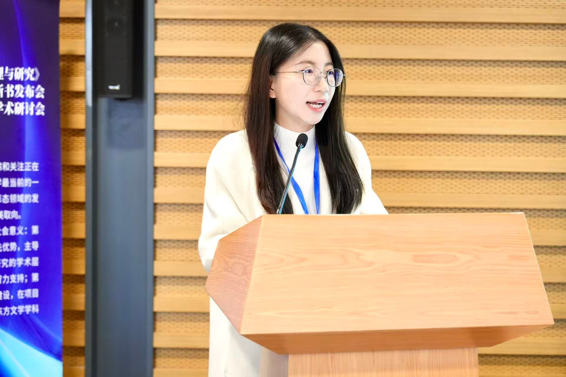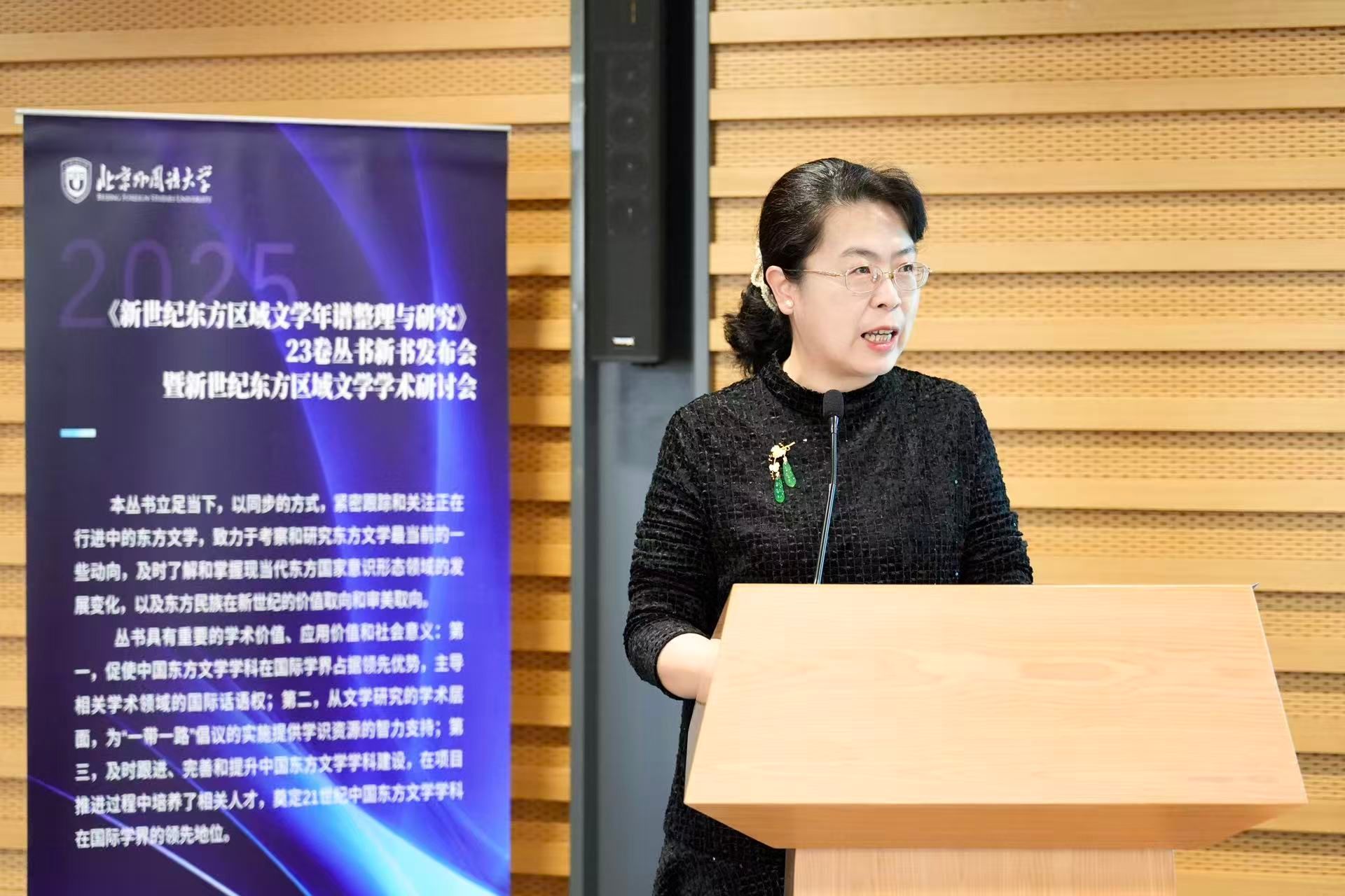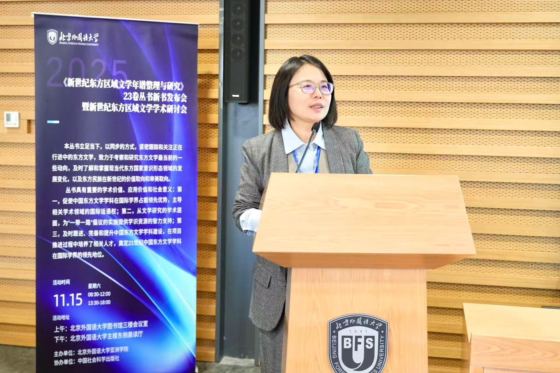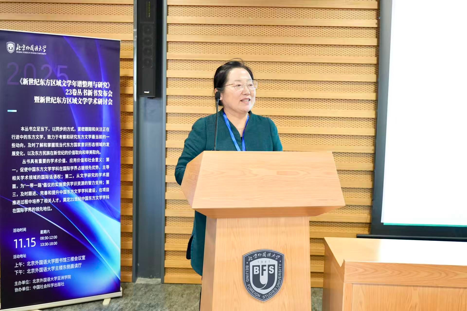 院长苏莹莹主持。苏莹莹向参加会议的领导、专家学者和各界人士表达了感谢,并指出,该成果仰赖多方鼎力支持,以前瞻性的学术视野,系统整合了21世纪前20年的东方文学资料,成功构建了一个立足中国、客观平等的东方文学研究新体系。