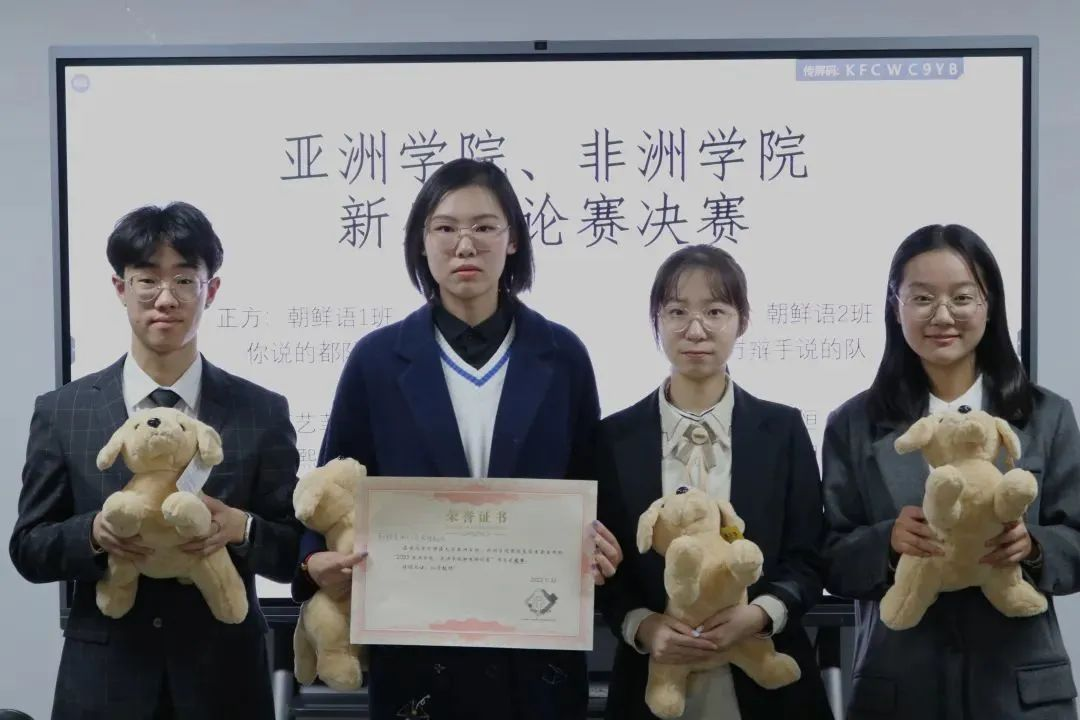 、非洲学院新生辩论赛冠军,朝鲜语2班“对方辩手说得队”获得亚军,希伯来语班“说的都队”获得季军;本场比赛的反方二辩童翰泽荣膺决赛“最佳辩手”。